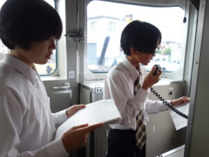 出発式はあおぞら号の中で、車掌さんのマイクをお借りして行いました。ちょっとレアな体験!