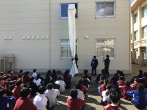 今回は学校の点検日と合わせてシューターの体験や、この地域の防災についてお話を聞く機会になりました。